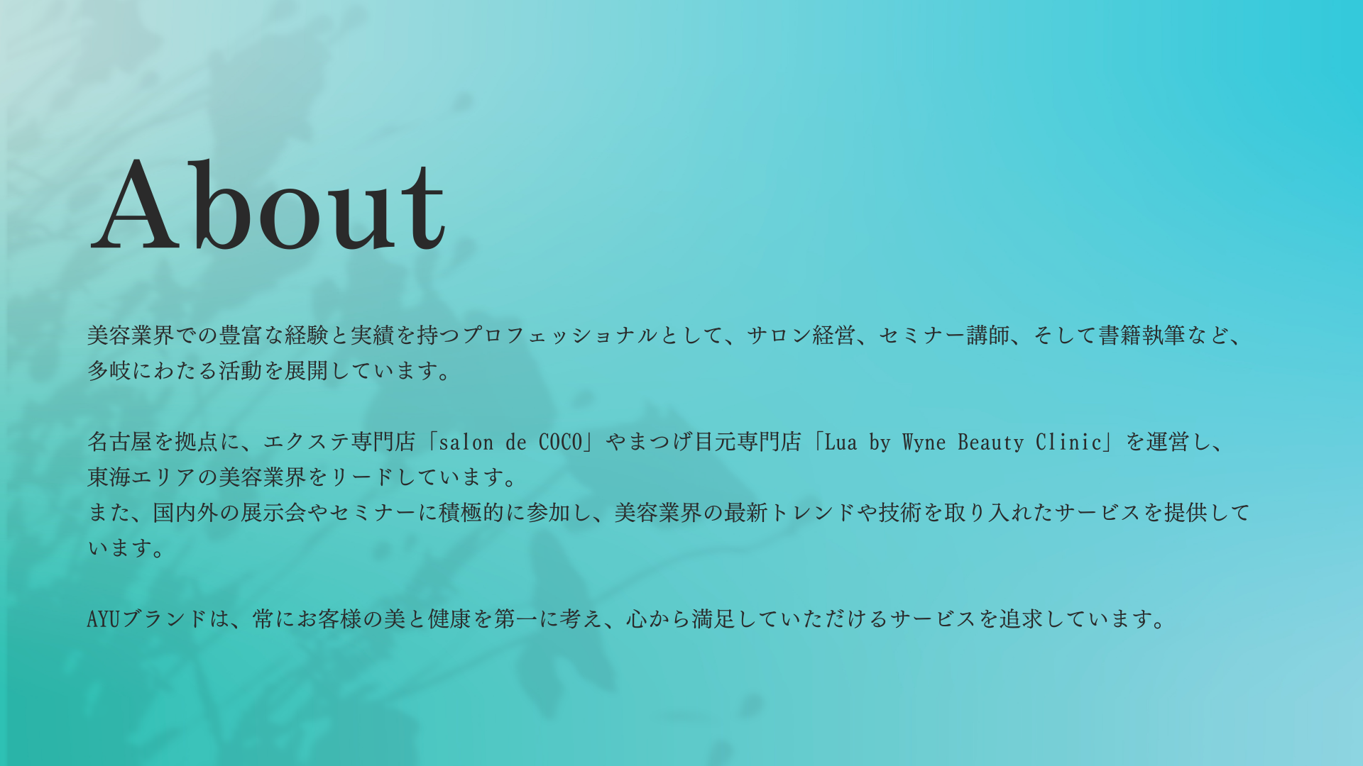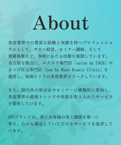 愛知県名古屋市を中心に美容サロンを展開し、美容サロン経営者として以外でもヘアメイクアップアーティスト・モデル・著者・講師として活躍。